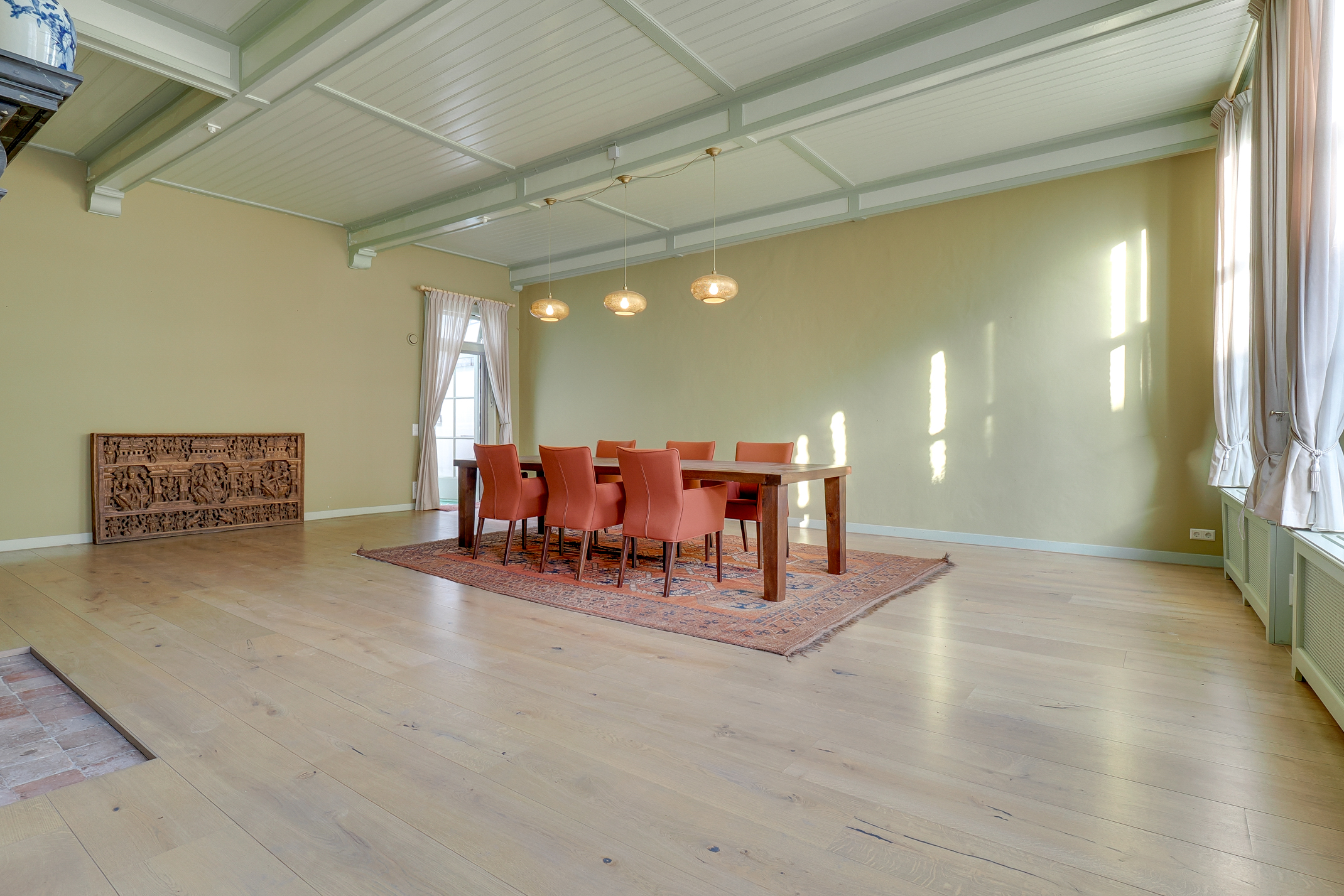 U komt binnen in een royale hal met toegang tot alle vertrekken. De ruime en sfeervolle woonkamer is een absolute eyecatcher: een indrukwekkende ruimte van bijna 60 m², voorzien van hoge plafonds met sierlijke balken, een fraaie houten vloer en grote ramen die het daglicht rijkelijk binnenlaten. De monumentale schouw met marmeren details vormt het centrale punt in deze ruimte, die zich uitstekend leent voor een combinatie van wonen en royaal dineren. Via openslaande deur is er toegang tot een charmante buitenruimte. Deze buitenruimte ligt beschut aan de binnenzijde van het gebouw, en vormt een rustige plek om van de buitenlucht te genieten.