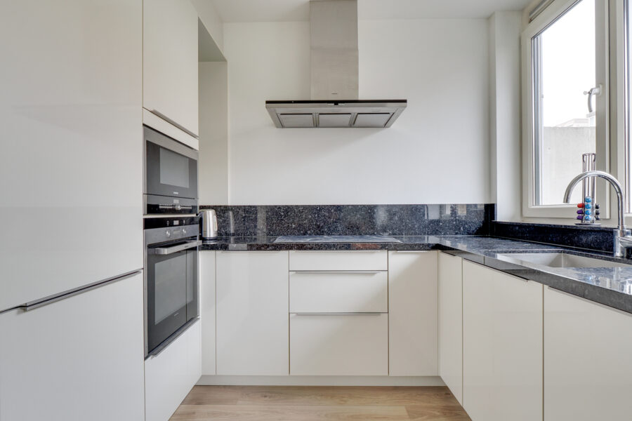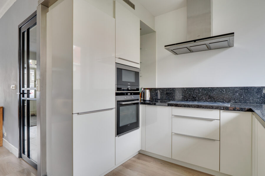 De ruimte is strak afgewerkt met een lichte laminaatvloer en heeft een open indeling waarbij woon- en eetgedeelte mooi in elkaar overlopen. Aan de achterzijde is de eethoek gesitueerd, perfect voor lange diners of gezellige spelletjesavonden. De open keuken grenst direct aan de eetkamer en is voorzien van greeploze, hoogglans kasten, een donker natuurstenen werkblad en diverse inbouwapparatuur.