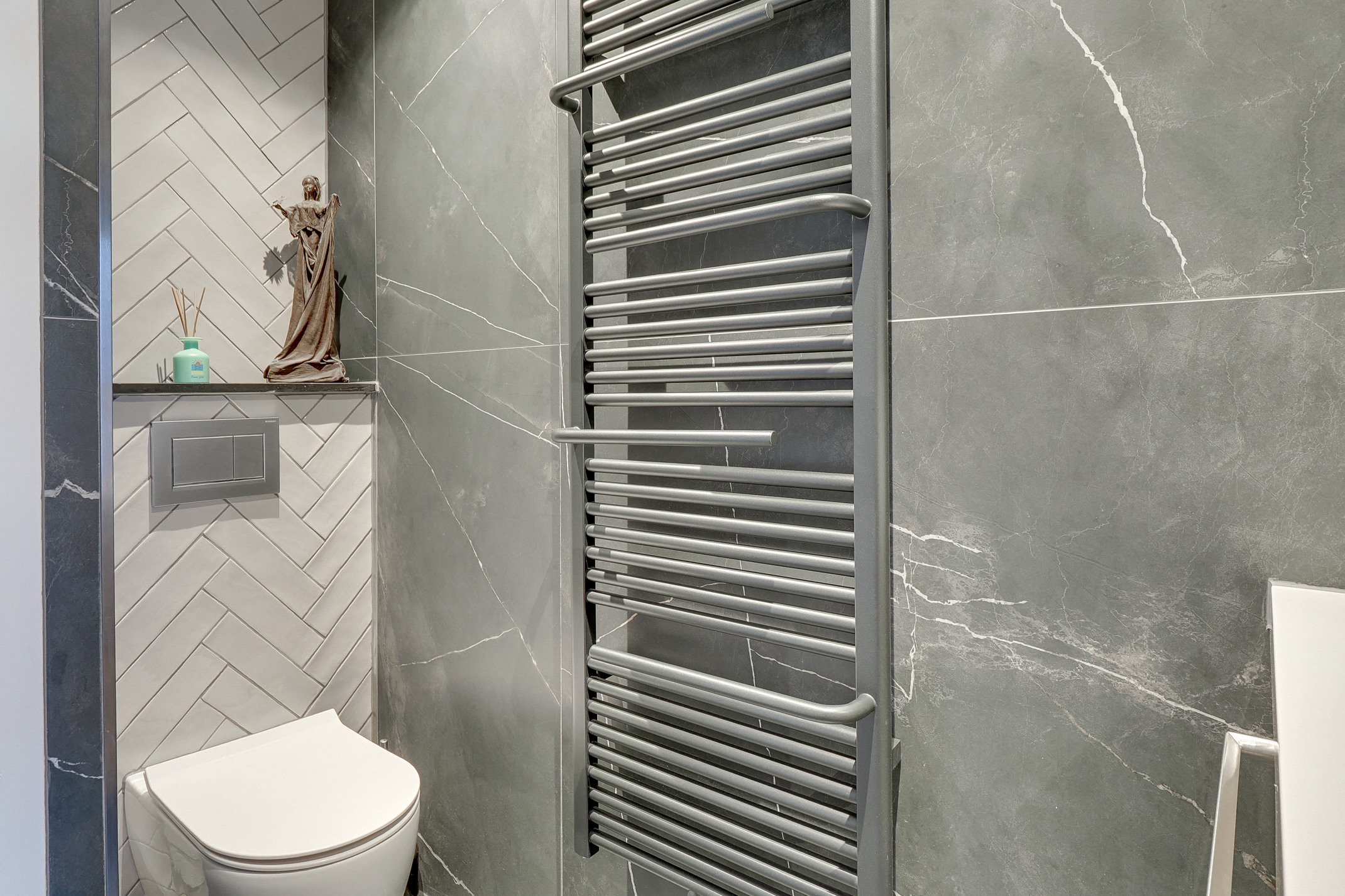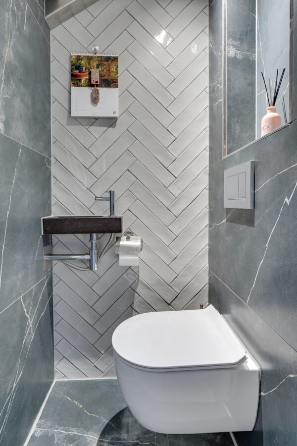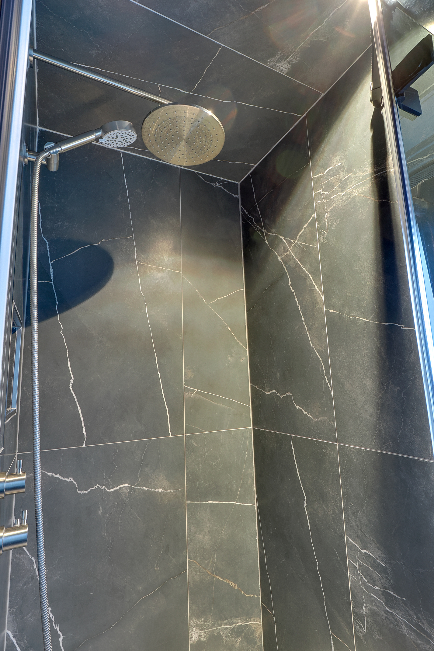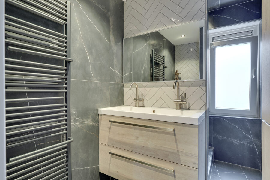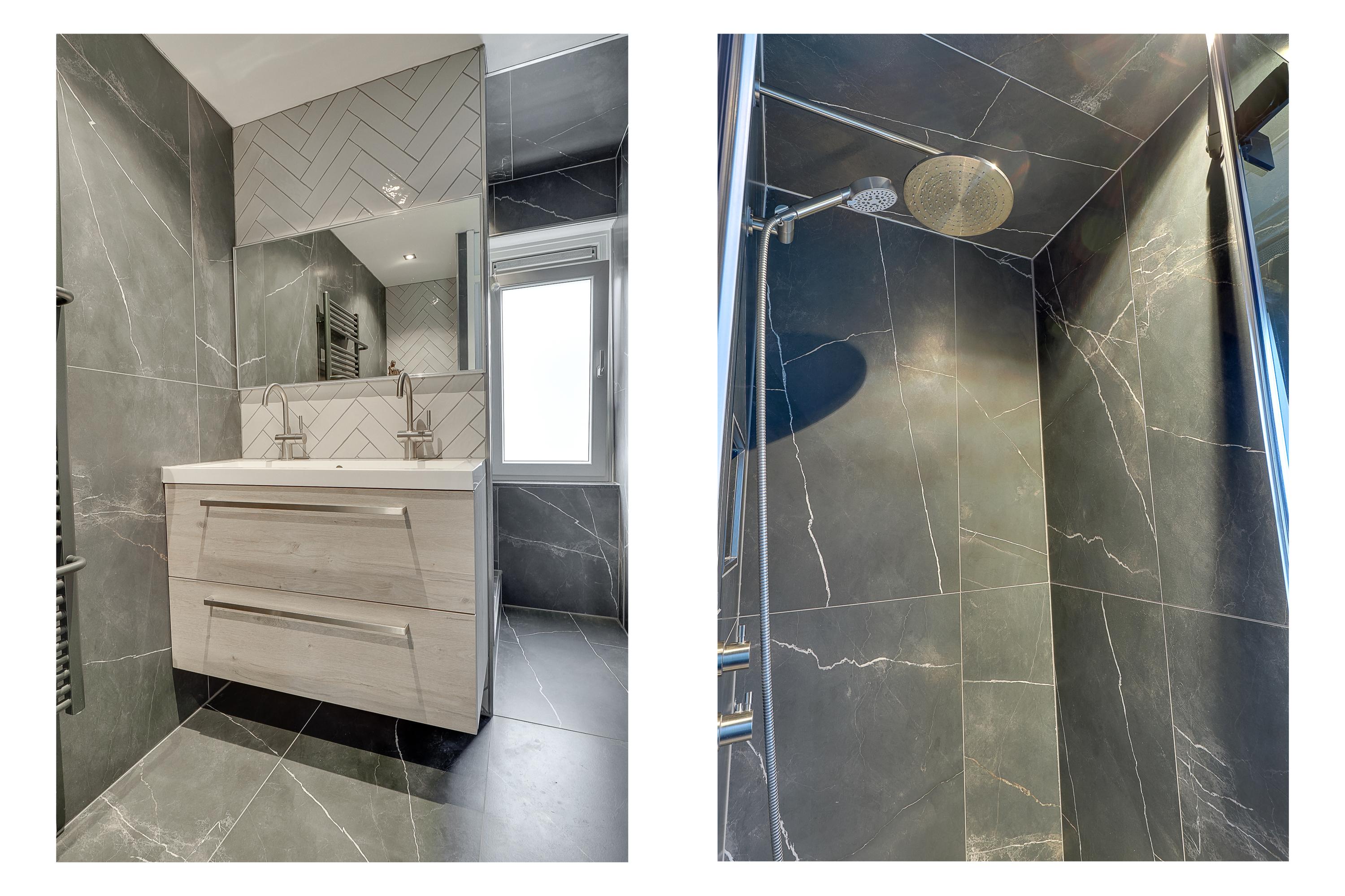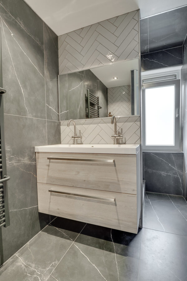 De badkamer, modern afgewerkt met grote marmerlook tegels, een royale inloopdouche met regendouche, dubbele wastafel met meubel, tweede toilet én comfortabele vloerverwarming.