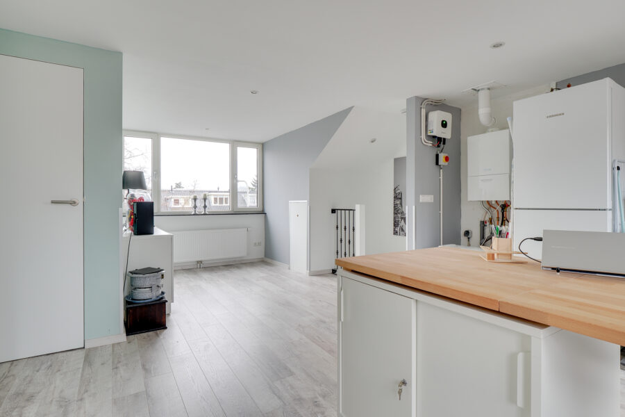 De tweede verdieping is verrassend ruim en momenteel ingericht als één grote open ruimte met volop lichtinval aan beide zijden. Dankzij de opgetrokken achtergevel en het brede dakkapel aan de voorzijde is er niet alleen veel ruimte, maar ook een fijne lichtbeleving. Met minimale ingrepen tover je deze etage om tot twee volwaardige (slaap)kamers, waarmee je het woonoppervlak optimaal benut.