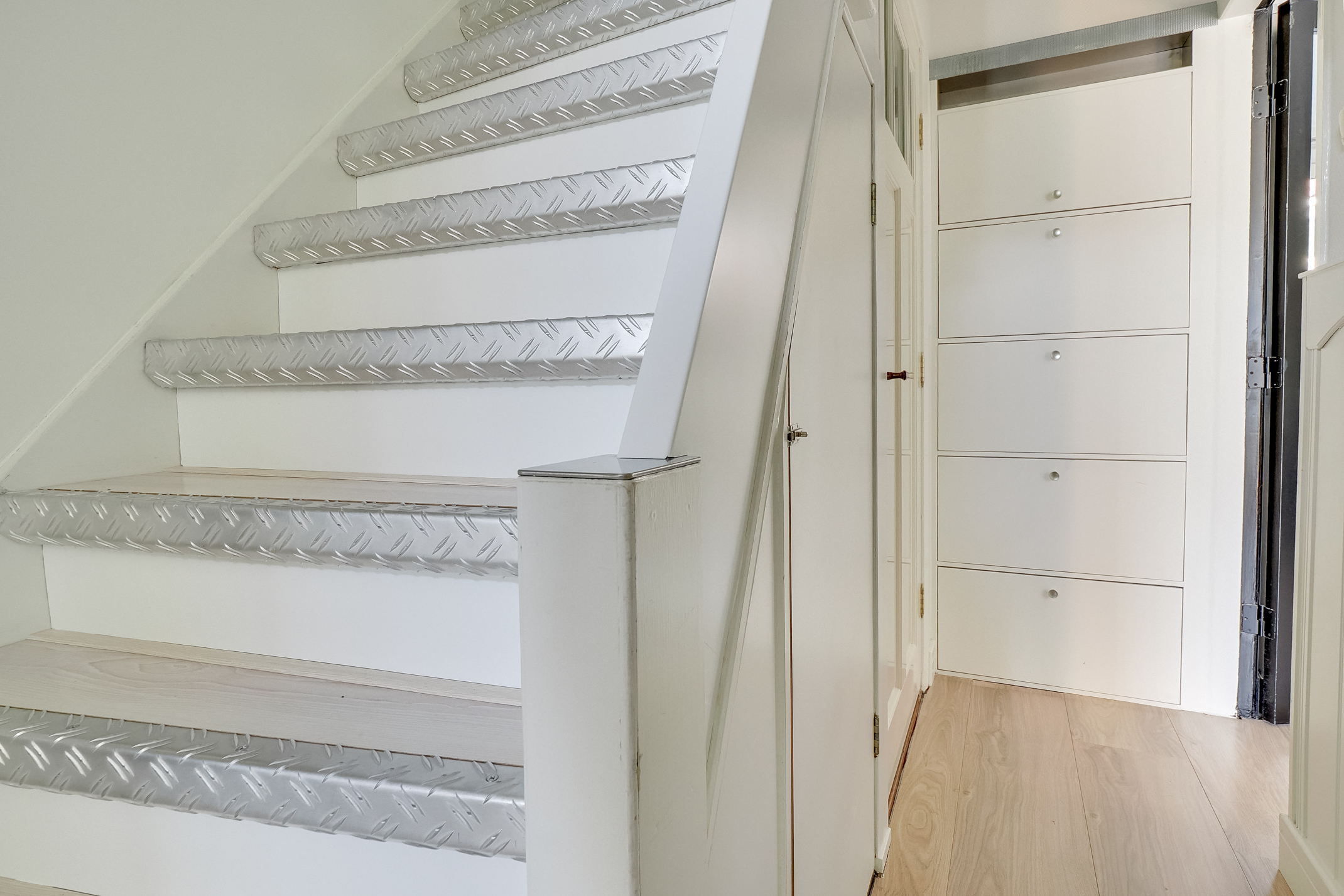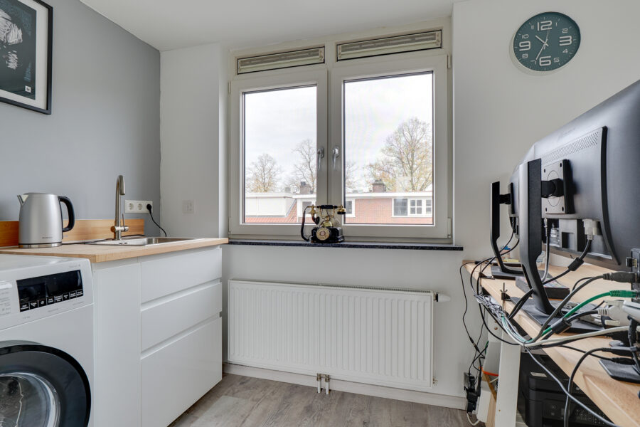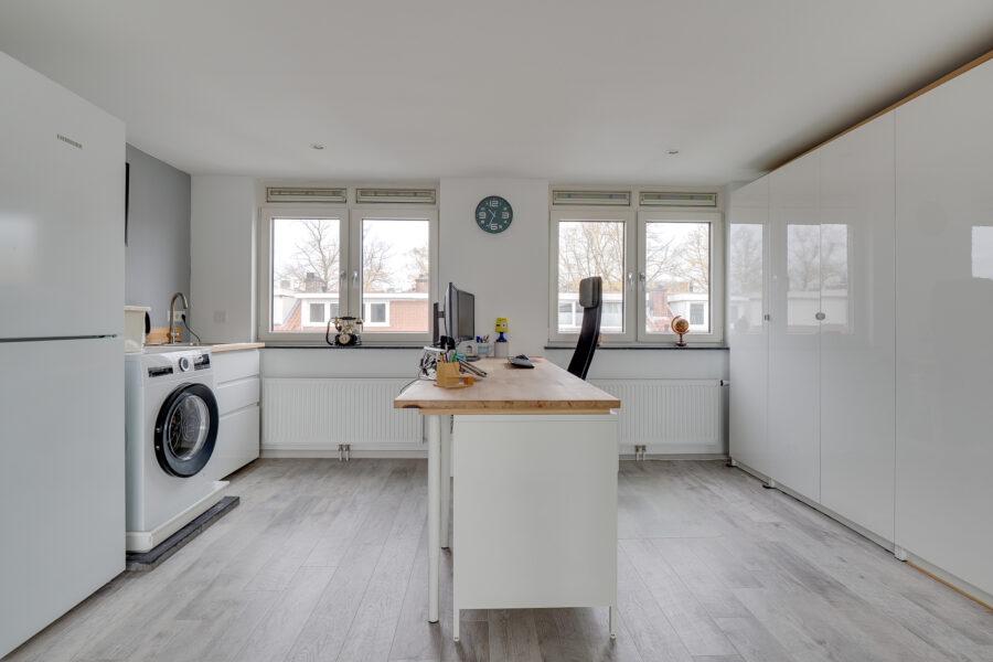 De verdieping beschikt over een moderne laminaatvloer, strak gestuukte wanden en inbouwspots voor een strakke uitstraling. De wasmachineaansluiting is netjes weggewerkt in een praktische opstelling met werkblad en spoelbak. Daarnaast is er volop bergruimte in de knieschotten en is ook de opstelling van de omvormer en cv-installatie keurig in het zicht weggewerkt.