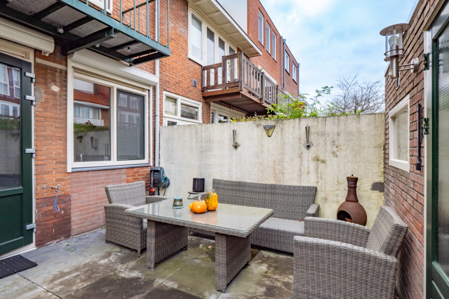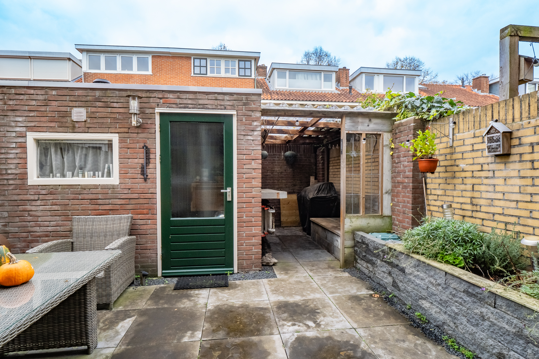 De achtertuin is gesitueerd op het westen, waardoor je hier de hele middag én avond van de zon kunt genieten. De tuin is strak betegeld en onderhoudsvriendelijk ingericht met een verhoogde plantenbak en gezellige zitplek. Achterin is een ruime stenen berging aanwezig, voorzien van elektra, ideaal voor fietsen, klusspullen of als hobbyruimte. Aangrenzend aan de berging bevindt zich een overdekte ruimte, momenteel in gebruik als overkapping met zitplek voor een barbecue. De tuin beschikt daarnaast over een praktische achterom.