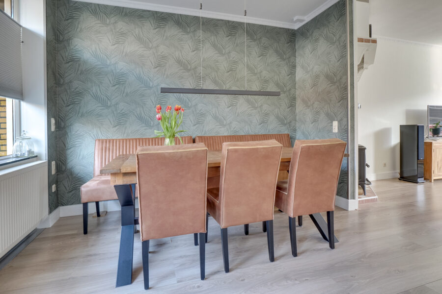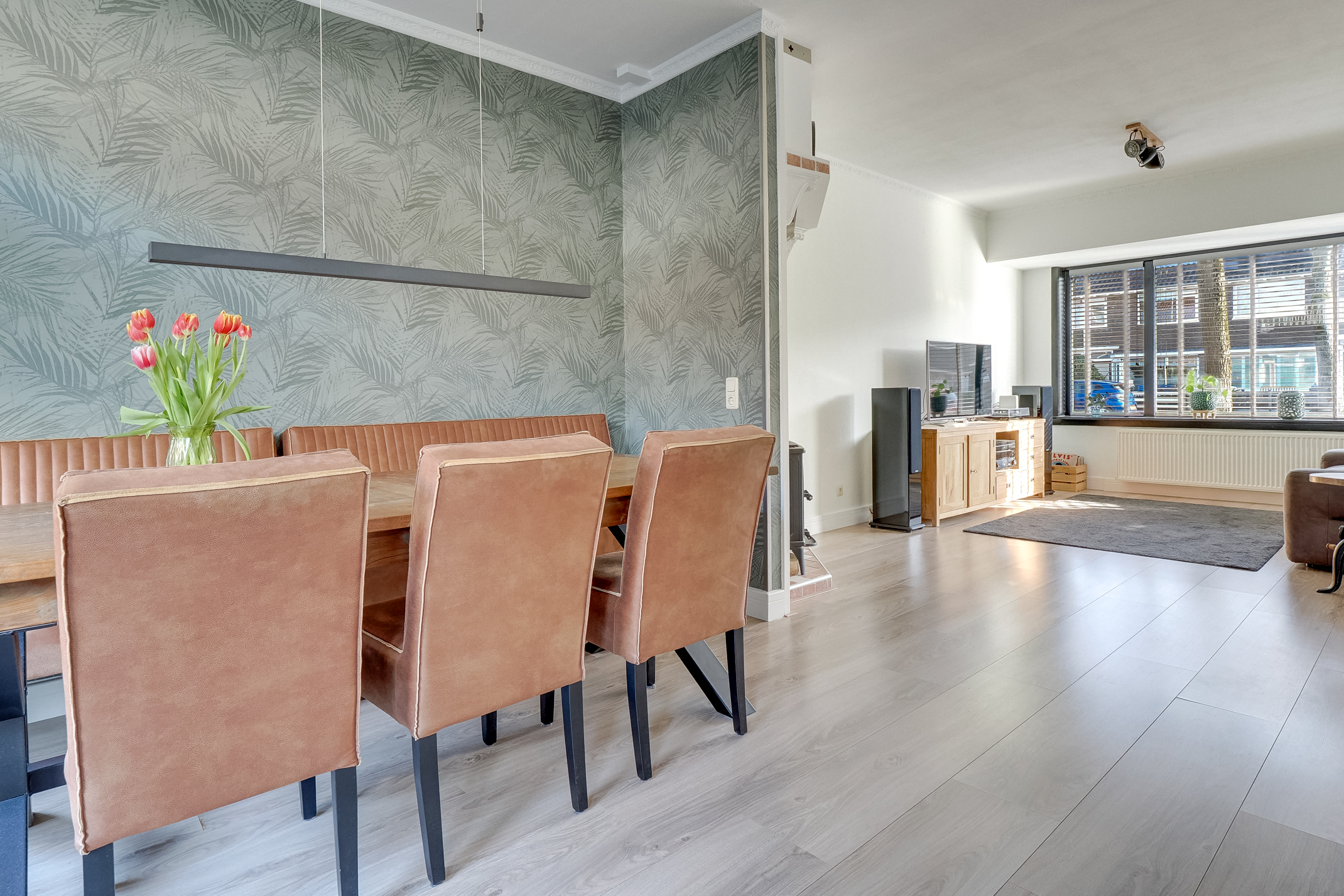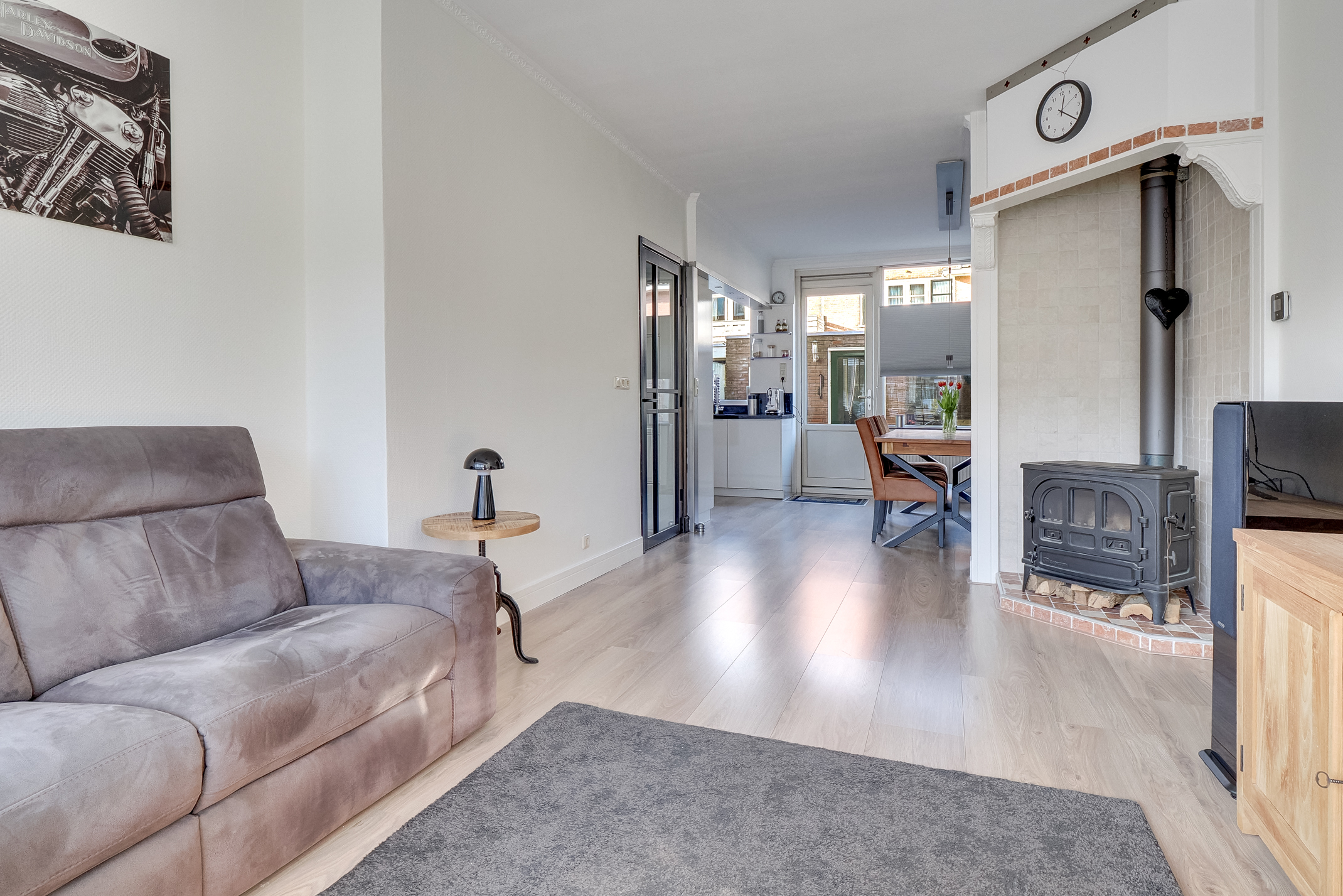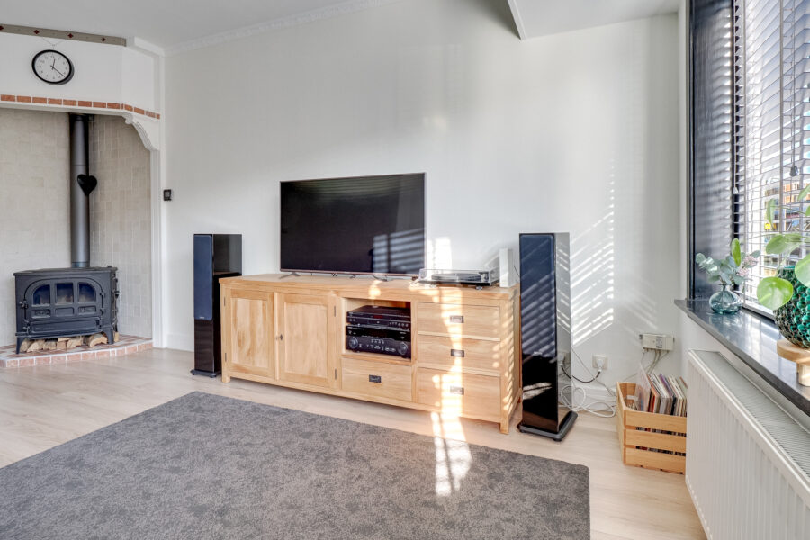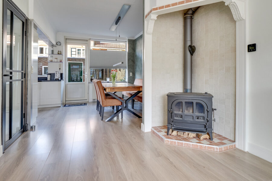 Bij binnenkomst valt direct de verzorgde afwerking op: een stijlvolle hal met lambrisering en een karaktervolle trapopgang leidt je via een moderne glazen taatsdeur naar het woongedeelte. De woonkamer ademt sfeer dankzij de erker aan de voorzijde, die zorgt voor prettig veel lichtinval, én de houtkachel die een warme ambiance creëert tijdens de wintermaanden.
