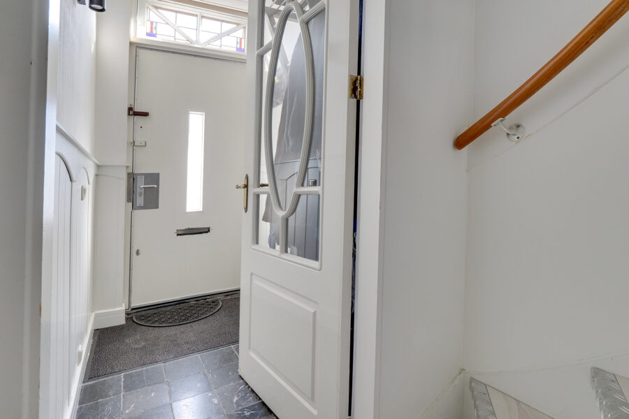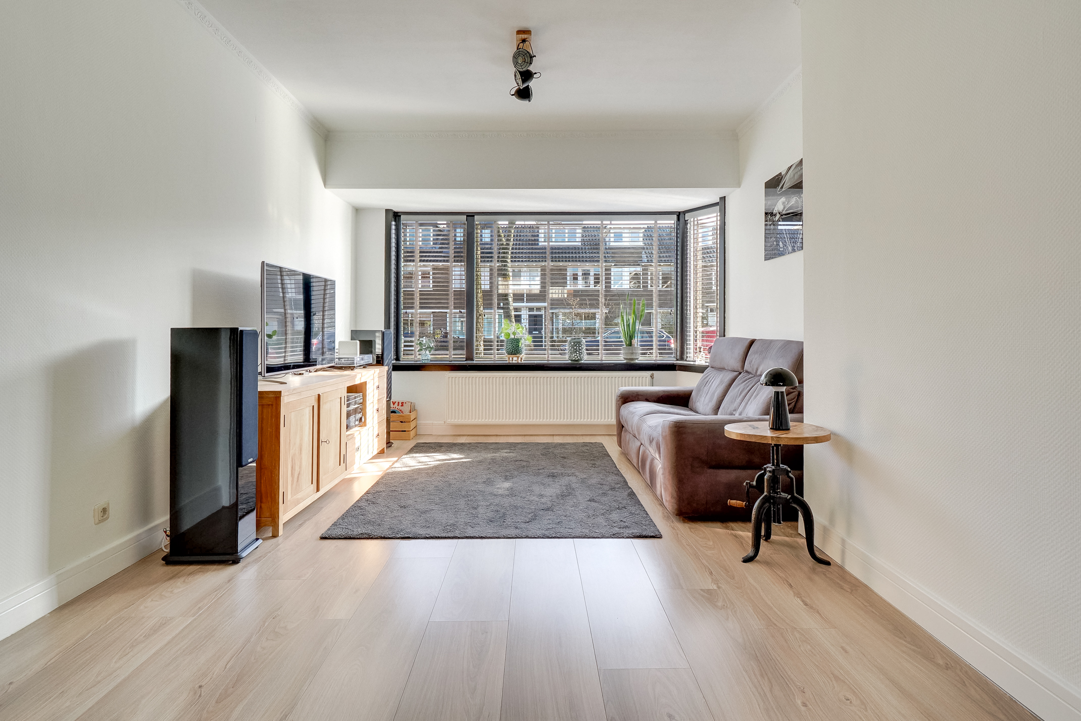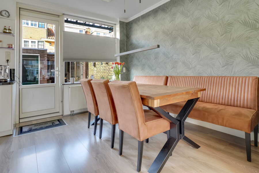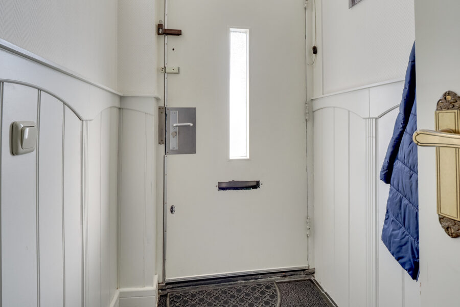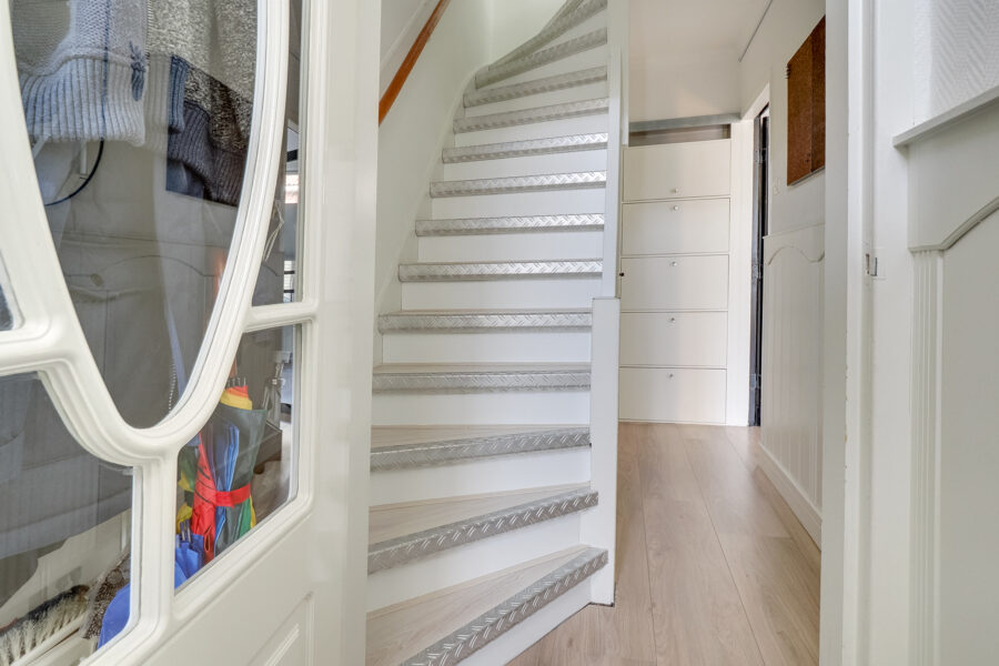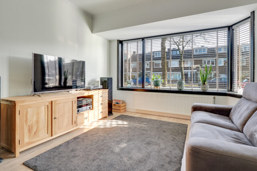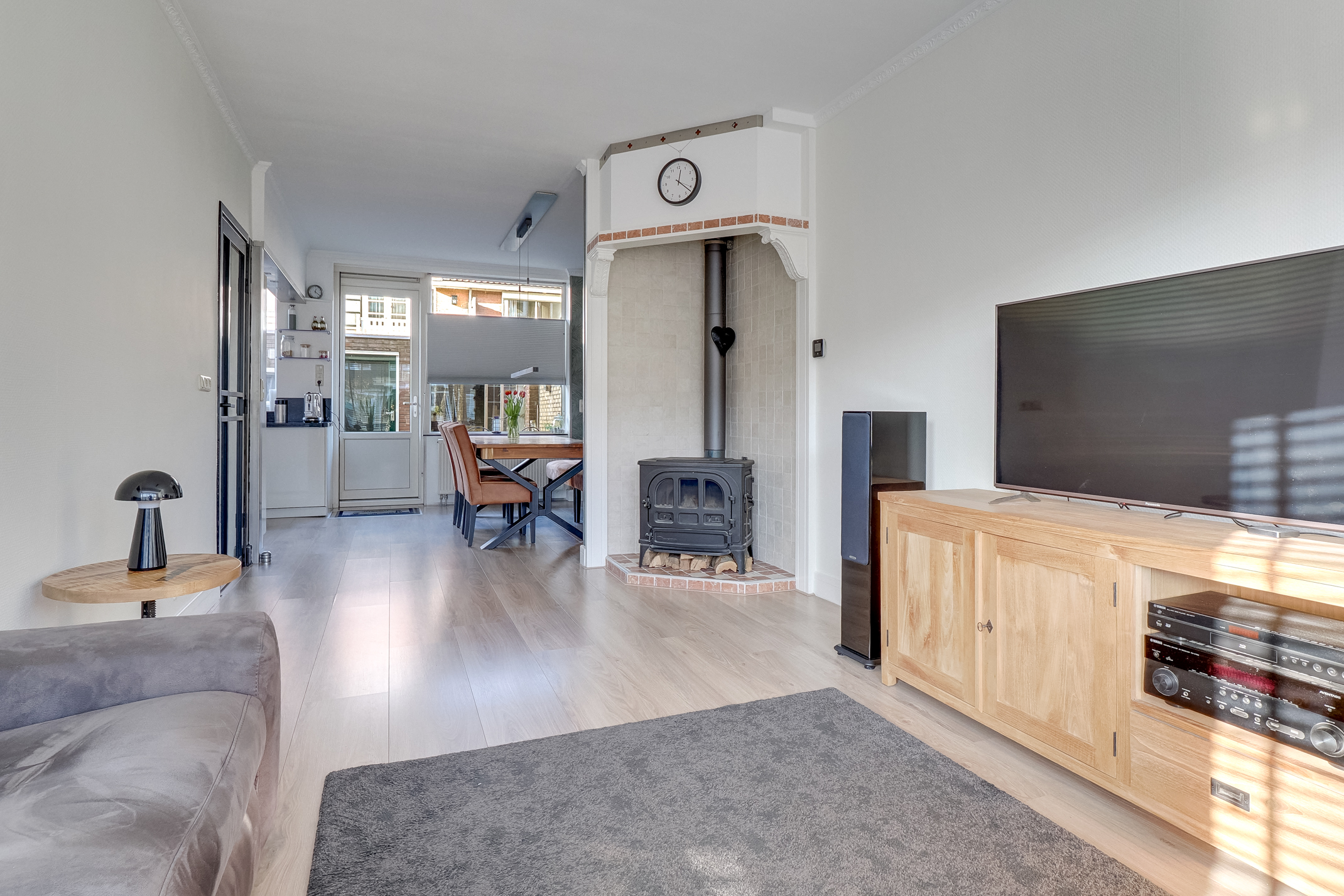Bij binnenkomst valt direct de verzorgde afwerking op: een stijlvolle hal met lambrisering en een karaktervolle trapopgang leidt je via een moderne glazen taatsdeur naar het woongedeelte. De woonkamer ademt sfeer dankzij de erker aan de voorzijde, die zorgt voor prettig veel lichtinval, én de houtkachel die een warme ambiance creëert tijdens de wintermaanden.